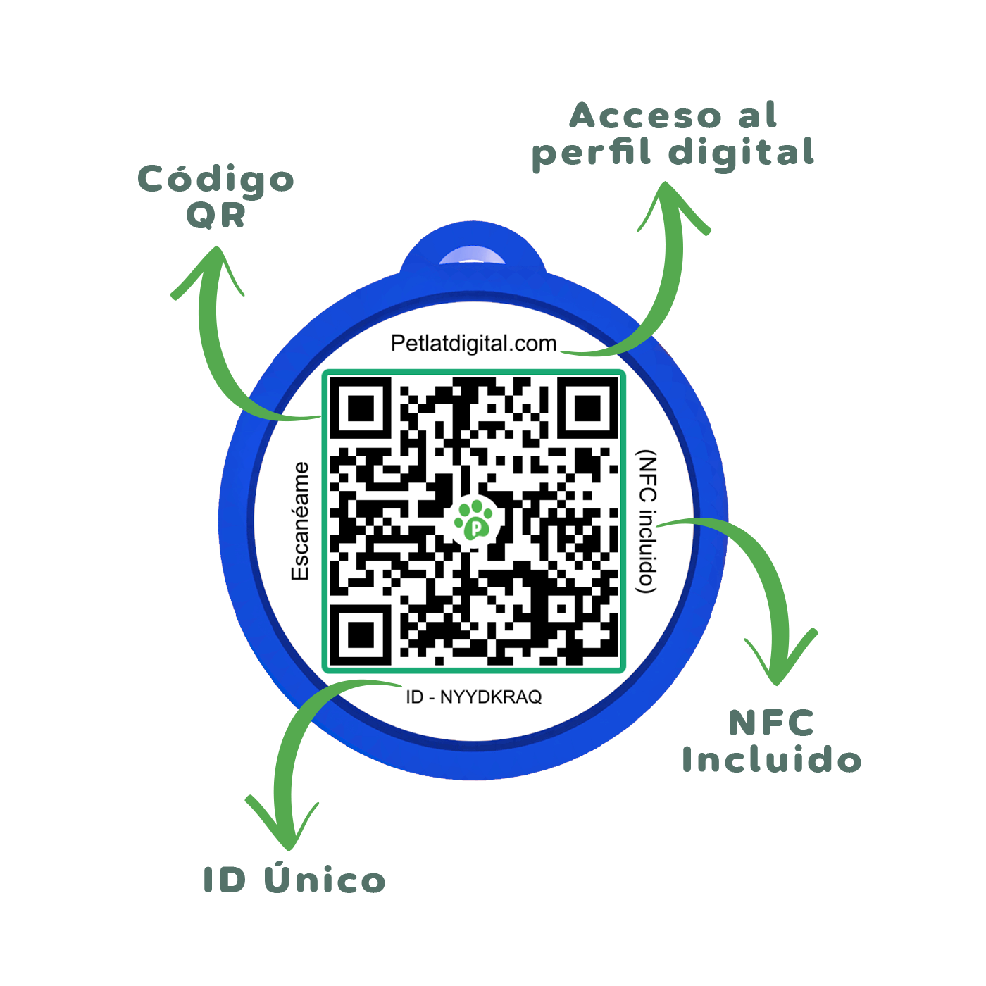 Incorpora un chip NFC pasivo (sin batería), diseñado exclusivamente para la identificación digital de tu mascota.